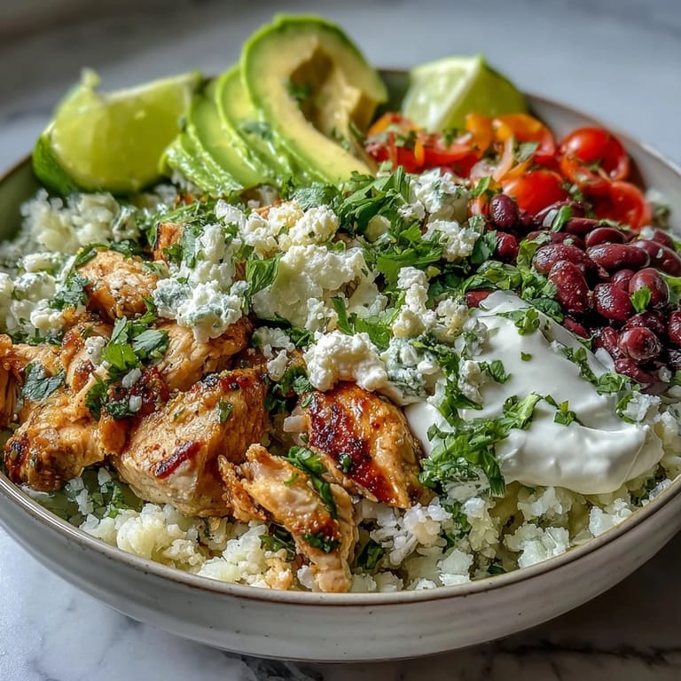 Prepare the cauliflower rice and cooked chicken in advance, then quickly assemble the bowl with fresh toppings when ready to eat.