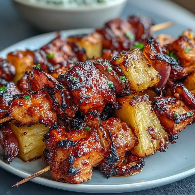 Save My neighbor Marcus showed up with a bag of fresh pineapples one July afternoon, insisting I needed to try grilling them. I was skeptical at first—fruit on a grill seemed like one of those trendy things that wouldn't actually work. But watching those golden chunks caramelize alongside smoky chicken and charred red onion changed my mind completely. Now these kebabs are my go-to when I want something that looks impressive but doesn't keep me stressed in the kitchen.