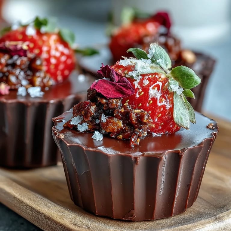 Save Imagine biting into a glossy dark chocolate cup that shatters gently under your teeth, revealing a jewel-toned filling of fresh strawberries perfumed with rosewater and orange zest. This is no ordinary dessert—this is a luxurious fusion of Middle Eastern elegance and modern indulgence. Inspired by the opulent flavors of Dubai, these chocolate strawberry cups are crowned with a caramelized pistachio crunch that adds both texture and a whisper of the exotic. Perfect for entertaining or treating yourself to something truly special, they're deceptively simple to make yet taste like they came from a high-end patisserie.