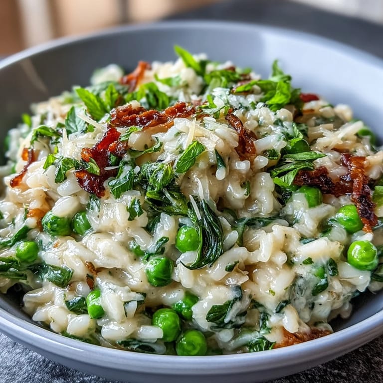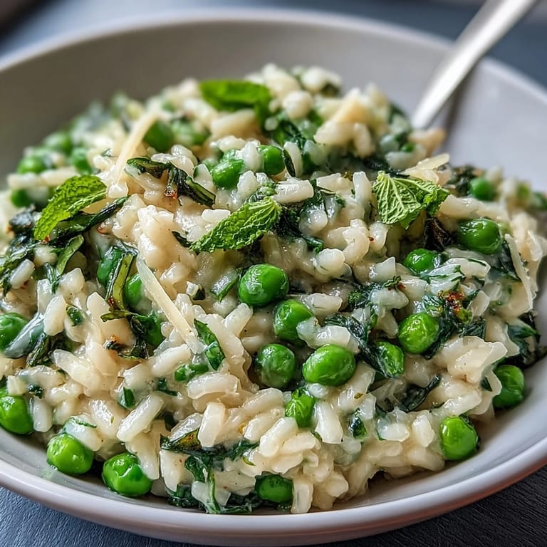 Save Risotto is one of those dishes that looks intimidating but rewards you with pure comfort. The key is patience—standing at the stove, stirring gently, and letting each ladleful of broth be absorbed before adding the next. This meditative process transforms simple Arborio rice into something luxurious. The addition of peas near the end keeps them tender and sweet, while fresh mint and a touch of lemon zest lift the entire dish with unexpected freshness. Whether you're new to risotto or a seasoned home cook, this recipe strikes the perfect balance between classic technique and seasonal inspiration.