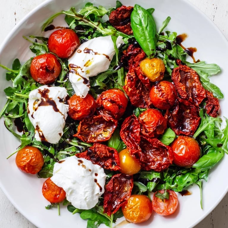 Save There's a moment in summer when tomatoes taste like they've been sitting in the sun for hours, and you realize you need to do something worthy of them. That's when I started playing with textures one lazy afternoon—fresh and bright, roasted and concentrated, sun-dried and intense—all on one plate with creamy burrata melting into the warm spots. The salad was born from refusing to choose just one way to eat a tomato.