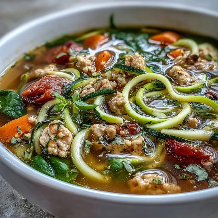 Save My sister texted me on a Tuesday asking for something that wouldn't leave her sluggish, and I found myself spiralizing zucchini at 6 PM with the kitchen filling up with that fresh, almost grassy smell. There's something satisfying about watching those thin ribbons curl out of the spiralizer—it feels lighter than rice or pasta before you even taste it. She came over that night skeptical about zucchini noodles, but three bowls later, she was asking for the recipe. That's when I knew this soup had staying power.